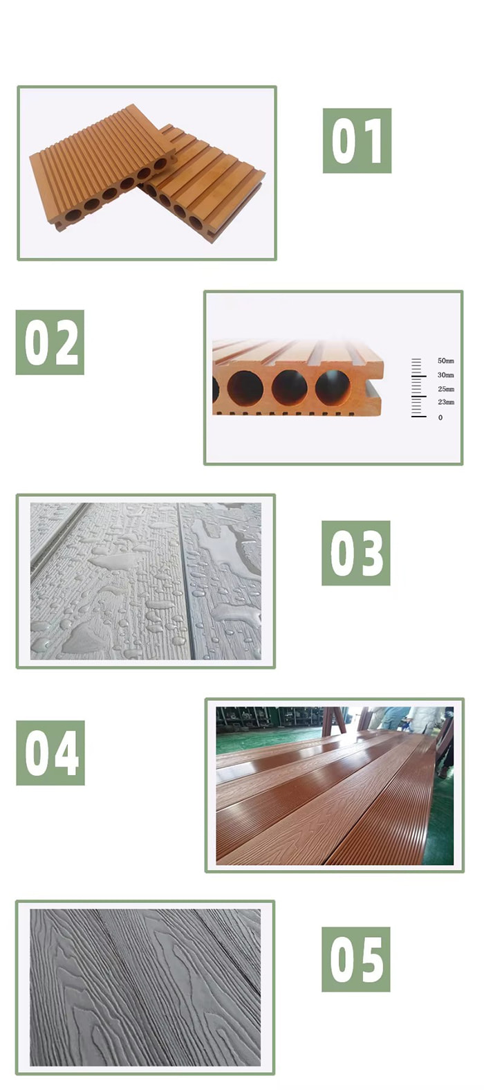 วัสดุ: ส่วนประกอบของเส้นใยไม้และเทอร์โมพลาสติก (เช่น โพลีเอทิลีนหรือโพลีไวนิลคลอไรด์)