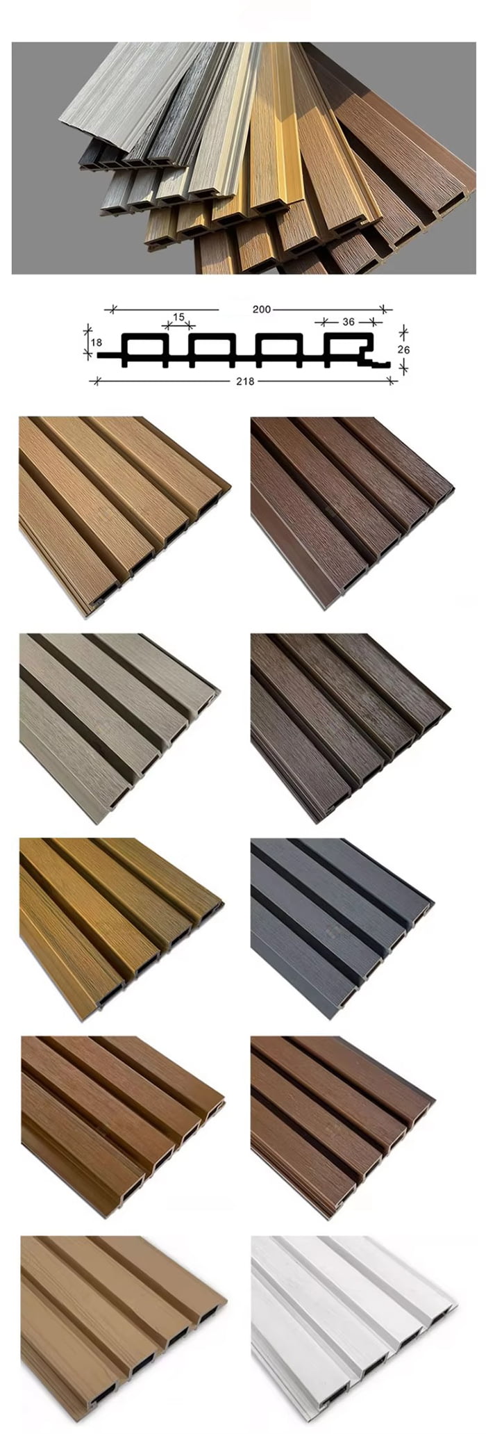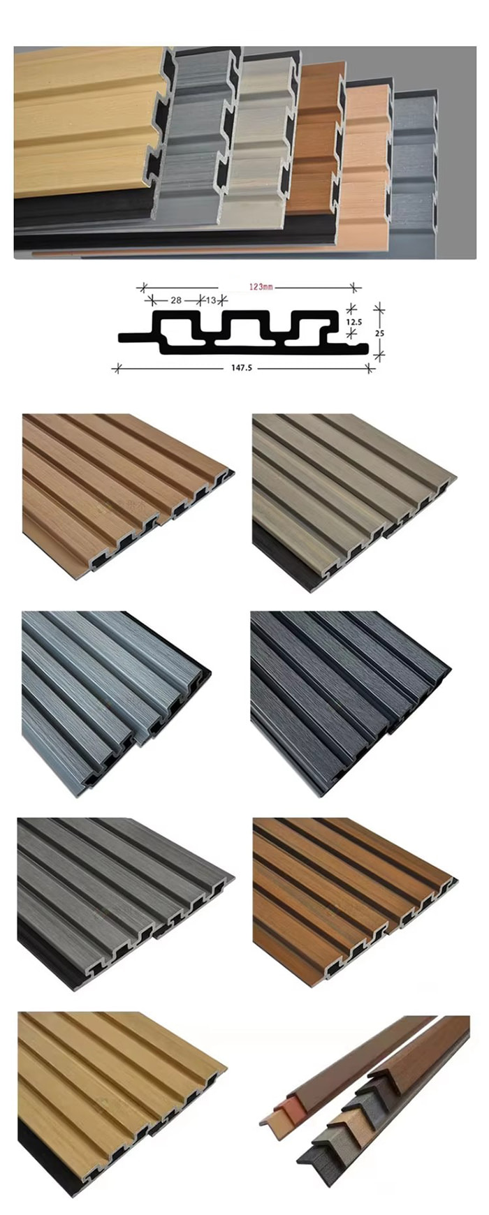 บอร์ดกลางแจ้ง WPC เป็นบอร์ดตกแต่งกลางแจ้งแบบพิเศษที่ทำจากเส้นใยไม้หรือเส้นใยไม้ไผ่เป็นวัตถุดิบหลัก ผสมกับพีวีซีเรซิน ผงแคลเซียมคาร์บอเนต และสารป้องกันรังสีอัลตราไวโอเลตผ่านกระบวนการที่อุณหภูมิสูงและแรงดันสูง พื้นผิวใช้การเคลือบบ่มด้วยรังสียูวีหรือเทคโนโลยีการถ่ายโอนลายไม้/หินเลียนแบบที่มีความแม่นยำสูง ซึ่งผสมผสานพื้นผิวของไม้ธรรมชาติเข้ากับความทนทานต่อสภาพอากาศของพลาสติก และมีคุณลักษณะกันน้ำและกันความชื้น ป้องกันโรคราน้ำค้างและต้านเชื้อแบคทีเรีย ป้องกันรังสีอัลตราไวโอเลต สารหน่วงไฟ ฯลฯ เหมาะสำหรับฉากต่างๆ เช่น ภูมิทัศน์สวน การตกแต่งผนังภายนอก เฟอร์นิเจอร์กลางแจ้ง ฯลฯ และเป็นทางเลือกที่เป็นมิตรกับสิ่งแวดล้อมแทนไม้และหินน้ำยาฆ่าเชื้อแบบดั้งเดิม